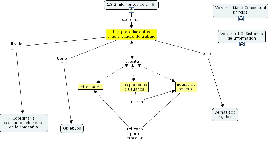 Los procedimientos y las pr�cticas de trabajo necesitan Las personas o usuarios, Los procedimientos y las pr�cticas de trabajo necesitan Equipo de soporte, Los procedimientos y las pr�cticas de trabajo necesitan Informaci�n, Equipo de soporte utilizado para procesar Informaci�n, 1.3.2. Elementos de un SI coordinan Los procedimientos y las pr�cticas de trabajo, Las personas o usuarios utilizan Equipo de soporte, Los procedimientos y las pr�cticas de trabajo utilizados para Coordinar a los distintos elementos de la compa�ia, Los procedimientos y las pr�cticas de trabajo no son Demasiado r�gidos, Los procedimientos y las pr�cticas de trabajo tienen unos Objetivos