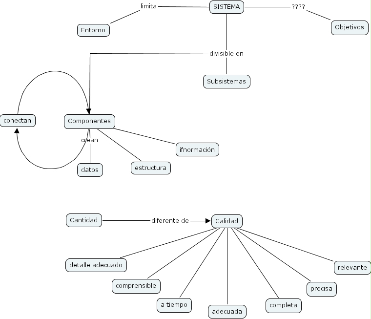 SISTEMA divisible en Subsistemas, SISTEMA divisible en Componentes, Calidad ???? completa, Componentes ???? conectan, Entorno limita SISTEMA, Cantidad diferente de Calidad, SISTEMA ???? Objetivos, Calidad ???? precisa, Calidad ???? detalle adecuado, Calidad ???? adecuada, Calidad ???? relevante, Componentes crean datos, Componentes ifnormaci�n, Calidad ???? comprensible, Calidad ???? a tiempo