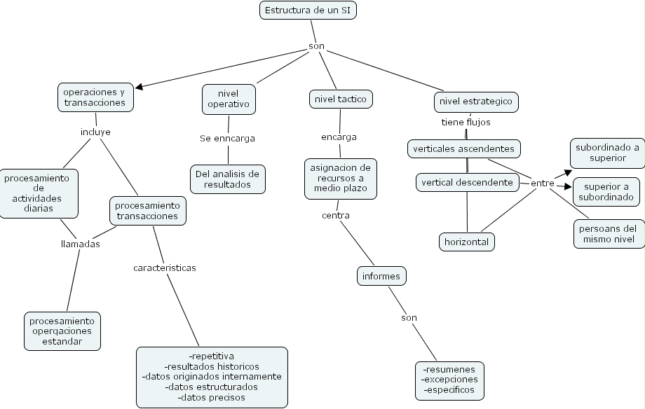 Estructura de un SI son nivel tactico, Estructura de un SI son nivel operativo, Estructura de un SI son nivel estrategico, Estructura de un SI son operaciones y transacciones, operaciones y transacciones incluye procesamiento de actividades diarias, operaciones y transacciones incluye procesamiento transacciones, procesamiento transacciones llamadas procesamiento operqaciones estandar, verticales ascendentes entre superior a subordinado, verticales ascendentes entre subordinado a superior, verticales ascendentes entre persoans del mismo nivel, nivel operativo Se enncarga Del analisis de resultados, asignacion de recursos a medio plazo centra informes, informes son -resumenes -excepciones -especificos, vertical descendente entre superior a subordinado, vertical descendente entre subordinado a superior, vertical descendente entre persoans del mismo nivel, nivel estrategico tiene flujos horizontal, nivel estrategico tiene flujos verticales ascendentes, nivel estrategico tiene flujos vertical descendente, procesamiento transacciones caracteristicas -repetitiva -resultados historicos -datos originados internamente -datos estructurados -datos precisos, horizontal entre superior a subordinado, horizontal entre subordinado a superior, horizontal entre persoans del mismo nivel, nivel tactico encarga asignacion de recursos a medio plazo, procesamiento de actividades diarias llamadas procesamiento operqaciones estandar