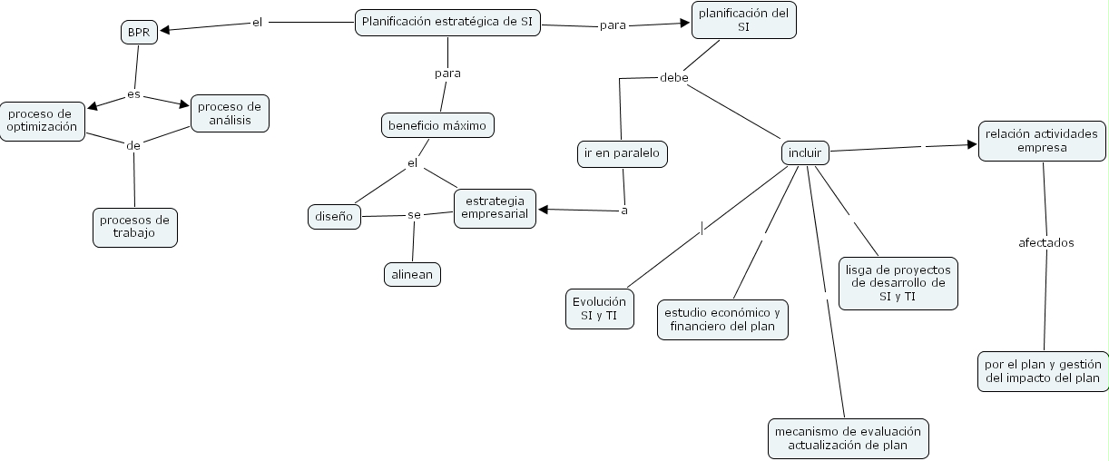 proceso de optimizaci�n de procesos de trabajo, proceso de optimizaci�n de proceso de an�lisis, planificaci�n del SI debe ir en paralelo, planificaci�n del SI debe incluir, Planificaci�n estrat�gica de SI el BPR, dise�o se alinean, Planificaci�n estrat�gica de SI para planificaci�n del SI, relaci�n actividades empresa afectados por el plan y gesti�n del impacto del plan, beneficio m�ximo el dise�o, beneficio m�ximo el estrategia empresarial, ir en paralelo a estrategia empresarial, incluir estudio econ�mico y financiero del plan, incluir Evoluci�n SI y TI, incluir relaci�n actividades empresa, Planificaci�n estrat�gica de SI para beneficio m�ximo, incluir mecanismo de evaluaci�n actualizaci�n de plan, incluir lisga de proyectos de desarrollo de SI y TI, estrategia empresarial se alinean, BPR es proceso de optimizaci�n, BPR es proceso de an�lisis