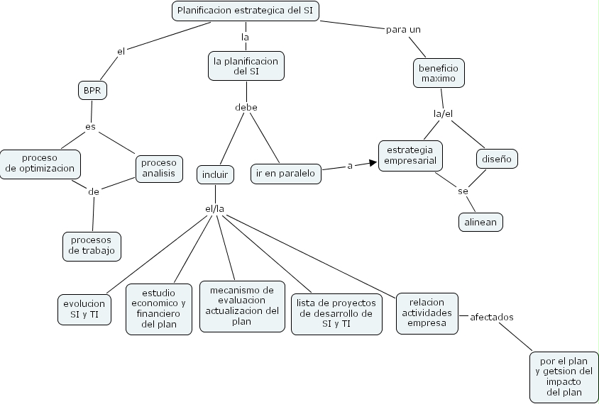 BPR es proceso analisis, BPR es proceso de optimizacion, proceso analisis de procesos de trabajo, la planificacion del SI debe ir en paralelo, la planificacion del SI debe incluir, beneficio maximo la/el estrategia empresarial, beneficio maximo la/el dise�o, ir en paralelo a estrategia empresarial, dise�o se alinean, proceso de optimizacion de procesos de trabajo, Planificacion estrategica del SI para un beneficio maximo, relacion actividades empresa afectados por el plan y getsion del impacto del plan, incluir el/la lista de proyectos de desarrollo de SI y TI, incluir el/la evolucion SI y TI, incluir el/la estudio economico y financiero del plan, incluir el/la mecanismo de evaluacion actualizacion del plan, incluir el/la relacion actividades empresa, Planificacion estrategica del SI la la planificacion del SI, Planificacion estrategica del SI el BPR, estrategia empresarial se alinean