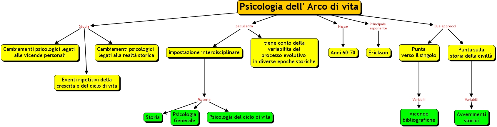 impostazione interdisciplinare Materie Storia, impostazione interdisciplinare Materie Psicologia Generale, impostazione interdisciplinare Materie Psicologia del ciclo di vita, Psicologia dell' Arco di vita Principale esponente Erickson, Punta verso il singolo Variabili Vicende bibliografiche, Psicologia dell' Arco di vita Studia Cambiamenti psicologici legati alla realt� storica, Psicologia dell' Arco di vita Studia Cambiamenti psicologici legati alle vicende personali, Psicologia dell' Arco di vita Studia Eventi ripetitivi della crescita e del ciclo di vita, Psicologia dell' Arco di vita peculiarit� impostazione interdisciplinare, Psicologia dell' Arco di vita peculiarit� tiene conto della variabilit� del processo evolutivo in diverse epoche storiche, Psicologia dell' Arco di vita Due approcci Punta sulla storia della civilt�, Psicologia dell' Arco di vita Due approcci Punta verso il singolo, Psicologia dell' Arco di vita Nasce Anni 60-70, Punta sulla storia della civilt� Variabili Avvenimenti storici