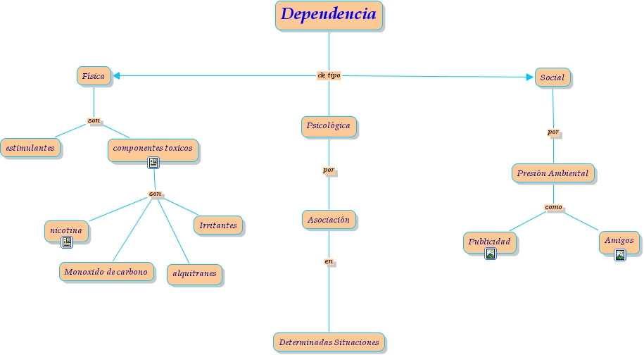 componentes toxicos son Monoxido de carbono, componentes toxicos son alquitranes, componentes toxicos son nicotina, componentes toxicos son Irritantes, Psicol�gica por Asociaci�n, Presi�n Ambiental como Amigos, Presi�n Ambiental como Publicidad, Asociaci�n en Determinadas Situaciones, Social por Presi�n Ambiental, Dependencia de tipo Psicol�gica, Dependencia de tipo F�sica, Dependencia de tipo Social, F�sica son estimulantes, F�sica son componentes toxicos