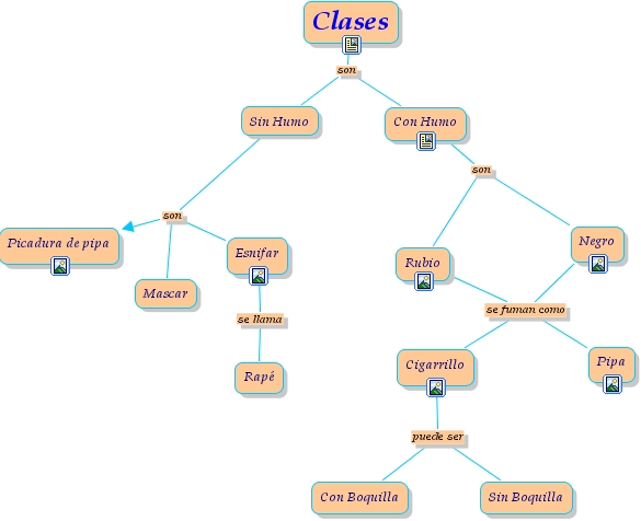 Sin Humo son Picadura de pipa, Sin Humo son Esnifar, Sin Humo son Mascar, Con Humo son Negro, Con Humo son Rubio, Negro se fuman como Cigarrillo, Negro se fuman como Pipa, Esnifar se llama Rap�, Rubio se fuman como Cigarrillo, Rubio se fuman como Pipa, Clases son Con Humo, Clases son Sin Humo, Cigarrillo puede ser Sin Boquilla, Cigarrillo puede ser Con Boquilla