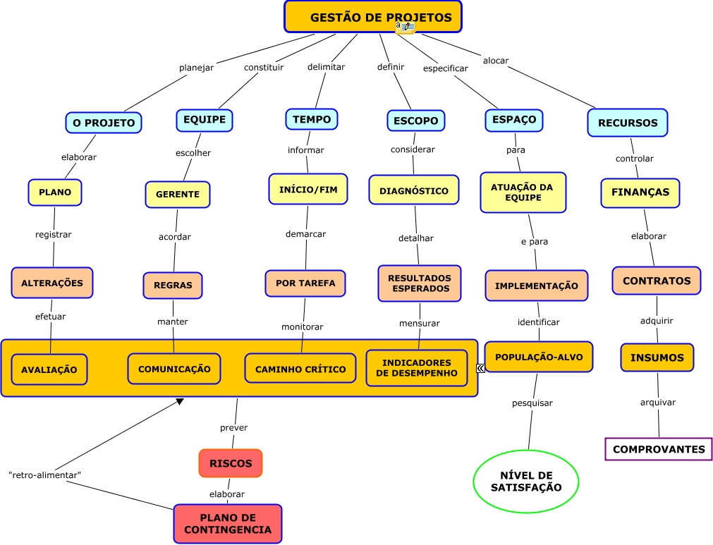 Esse mapa conceitual, produzido no IHMC CmapTools, tem a informação relacionada a: Gestão de Projetos, O PROJETO elaborar PLANO, GESTÃO DE PROJETOS definir ESCOPO, INÍCIO/FIM demarcar POR TAREFA, IMPLEMENTAÇÃO identificar POPULAÇÃO-ALVO, GESTÃO DE PROJETOS planejar O PROJETO, EQUIPE escolher GERENTE, PLANO registrar ALTERAÇÕES, TEMPO informar INÍCIO/FIM, INSUMOS arquivar COMPROVANTES, FINANÇAS elaborar CONTRATOS, PLANO DE CONTINGENCIA "retro-alimentar" ????, ???? prever RISCOS, GESTÃO DE PROJETOS constituir EQUIPE, DIAGNÓSTICO detalhar RESULTADOS ESPERADOS, RESULTADOS ESPERADOS mensurar INDICADORES DE DESEMPENHO, ATUAÇÃO DA EQUIPE e para IMPLEMENTAÇÃO, ESCOPO considerar DIAGNÓSTICO, ESPAÇO para ATUAÇÃO DA EQUIPE, CONTRATOS adquirir INSUMOS, GESTÃO DE PROJETOS especificar ESPAÇO