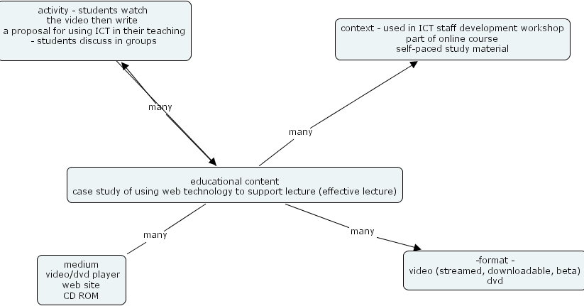 content brainwave, activity - students watch the video then write a proposal for using ict in their teaching - students discuss in groups , educational content case study of using web technology to support lecture (effective lecture), context - used in ict staff development workshop part of online course self-paced study material, medium video dvd player web site cd rom, -format - video (streamed, downloadable, beta) dvd