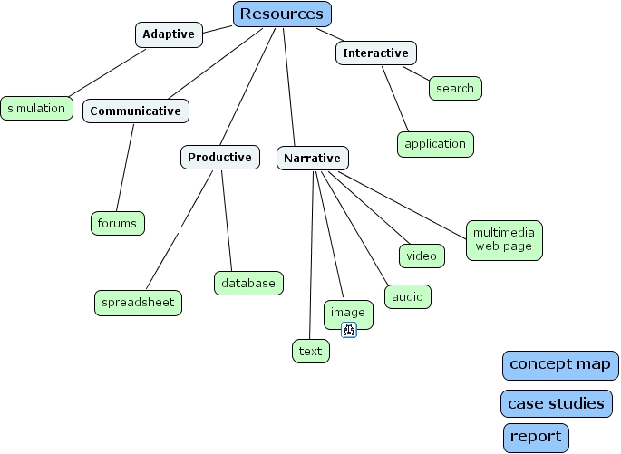 resources for e-learning, video, image, adaptive, text, simulation, multimedia web page, database, forums, case studies, resources, application, spreadsheet, report, interactive, audio, search, productive, concept map, communicative, narrative