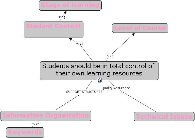 team 4, information organisation, students should be in total control of their own learning resources, technical issues, level of course, student context , stage of learning, keywords