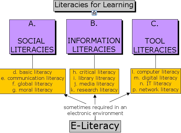 original model, h. critical literacy i. library litreracy j. media literacy k. research literacy, a. social literacies, d. basic literacy e. communication literacy f. global literacy g. moral literacy, e-literacy, literacies for learning, l. computer literacy m. digital literacy n. it literacy p. network literacy, b. information literacies, c. tool literacies