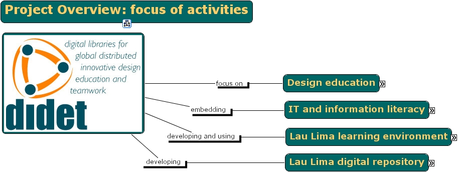 1. didet project focus areas, project overview focus of activities, curriculum design, lau lima learning environment, understanding concepts of file sharing, sustainability, storing and sharing content, design education, , information sources, searching and retrieval, development led by educational design not technology, key challenges, size of objects to be stored, identifying appropriate teaching models, quality of content, applying metadata, tracking informal activities, who teaches this element, team communication, educational value of searching for information themselves, lau lima digital repository, designing classes, translating educational requirements into technical specification, problem based learning, legal issues - drm, ????, understanding and applying metadata, key challenges, it and information literacy, key challenges, reflective practice, design education, ????, key challenges, who will use the content and how, cross team activities, accessing information, collaborative team working, lau lima learning environment, metadata and standards , maintenance of content accuracy and quality, managing organising information, measuring outcomes