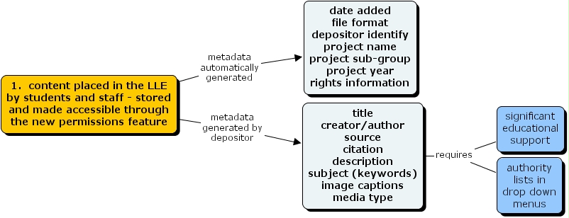metadata1, authority lists in drop down menus, 1. content placed in the lle by students and staff - stored and made accessible through the new permissions feature, date added file format depositor identify project name project sub-group project year rights information, title creator author source citation description subject (keywords) image captions media type, significant educational support