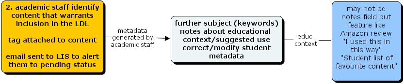metadata 2, may not be notes field but feature like amazon review i used this in this way student list of favourite content , 2. academic staff identify content that warrants inclusion in the ldl tag attached to content email sent to lis to alert them to pending status, further subject (keywords) notes about educational context suggested use correct modify student metadata