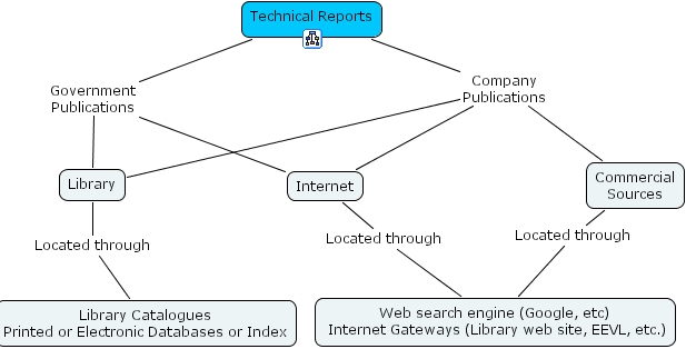 locating technical reports, library catalogues printed or electronic databases or index, commercial sources, web search engine (google, etc) internet gateways (library web site, eevl, etc.), internet, library, technical reports