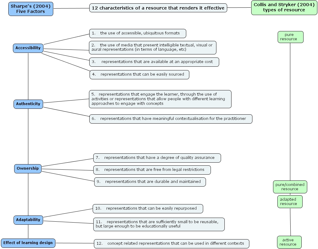 sharpes factors, 11. representations that are sufficiently small to be reusable, but large enough to be educationally useful, 12. concept related representations that can be used in different contexts , 5. representations that engage the learner, through the use of activities or representations that allow people with different learning approaches to engage with concepts, adapted resource , 6. representations that have meaningful contextualisation for the practitioner , 12 characteristics of a resource that renders it effective, adaptability, 3. representations that are available at an appropriate cost , pure resource , 7. representations that have a degree of quality assurance , 9. representations that are durable and maintained , sharpe's (2004) five factors, pure combined resource, 1. the use of accessible, ubiquitous formats , effect of learning design, ownership, collis and stryker (2004) types of resource, 4. representations that can be easily sourced , 8. representations that are free from legal restrictions , 10. representations that can be easily repurposed , 2. the use of media that present intelligible textual, visual or aural representations (in terms of language, etc), authenticity, accessibility, active resource