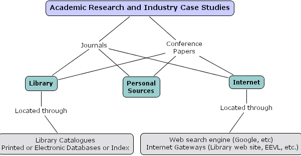locating academic research design methods, library catalogues printed or electronic databases or index, internet, web search engine (google, etc) internet gateways (library web site, eevl, etc.), personal sources, library, academic research and industry case studies