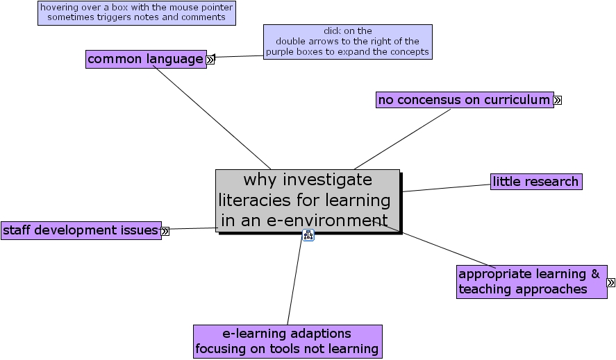 inspiration, content , why investigate literacies for learning in an e-environment , common language, hovering over a box with the mouse pointer sometimes triggers notes and comments, across sectors, across roles, no consensus on curriculum, no concensus on curriculum, little research, have to see the need to engage in their own learning, across subject discipline, staff development issues, course planning and development, staff development issues, e-learning adaptions focusing on tools not learning, whose job is it, appropriate learning & teaching approaches, click on the double arrows to the right of the purple boxes to expand the concepts, skills-based approach, across countries, common language, application of appropriate learning and teaching approaches, educational instructional developers may be the key