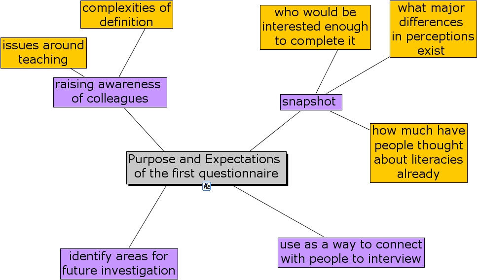 purpose and expectations, snapshot , complexities of definition, who would be interested enough to complete it, purpose and expectations of the first questionnaire, issues around teaching, identify areas for future investigation, use as a way to connect with people to interview, raising awareness of colleagues, how much have people thought about literacies already, what major differences in perceptions exist