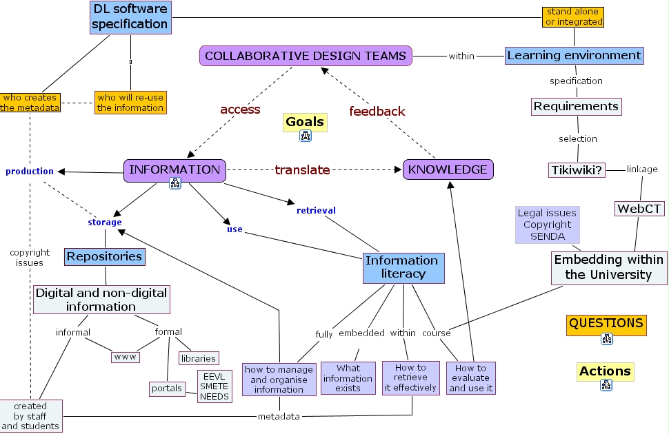 the beast, eevl smete needs, how to manage and organise information, portals, dl software specification, tikiwiki?, actions, legal issues copyright senda, information, goals, created by staff and students, digital and non-digital information, information literacy, requirements, embedding within the university, collaborative design teams, webct, how to retrieve it effectively, libraries, questions, how to evaluate and use it, who will re-use the information, production, repositories, www, what information exists, learning environment, , knowledge