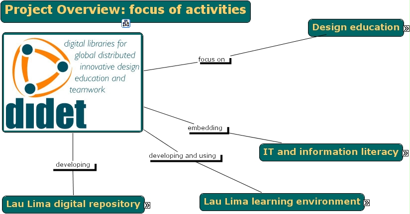 2. didet project focus areas, project overview focus of activities, curriculum design, lau lima learning environment, understanding concepts of file sharing, sustainability, storing and sharing content, design education, , information sources, searching and retrieval, development led by educational design not technology, key challenges, size of objects to be stored, identifying appropriate teaching models, quality of content, applying metadata, tracking informal activities, who teaches this element, team communication, educational value of searching for information themselves, lau lima digital repository, designing classes, translating educational requirements into technical specification, problem based learning, legal issues - drm, ????, understanding and applying metadata, key challenges, it and information literacy, key challenges, reflective practice, design education, ????, key challenges, who will use the content and how, cross team activities, accessing information, collaborative team working, lau lima learning environment, metadata and standards , maintenance of content accuracy and quality, managing organising information, measuring outcomes