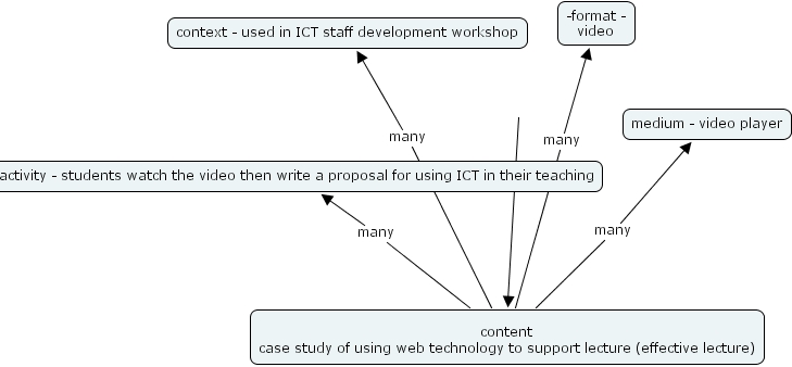 example 1, activity - students watch the video then write a proposal for using ict in their teaching, context - used in ict staff development workshop, content case study of using web technology to support lecture (effective lecture), -format - video, medium - video player
