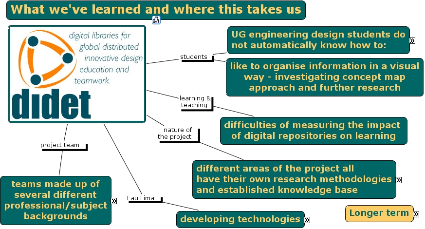 1. didet project learned, impact on design process, sustainability, ug engineering design students do not automatically know how to , different perceptions of others roles and backgrounds different areas of project, different languages, impact on student behaviour, longer term, integration with web ct, global teamwork research, ug engineering design students do not automatically know how to, like to organise information in a visual way - investigating concept map approach and further research, different areas of the project all have their own research methodologies and established knowledge base, differences, use of information, evaluating smaller elements of the project, critcally evaluate materials, difficulties of measuring the impact of digital repositories on learning, varied levels of engagement design education learning & teaching approaches information and it literacy tools and technologies, managing storing information, embed and integrate information literacy, dissemination, , identify the most appropriate sources of information (digital non-digital), apply metadata, ensure developments comply with standards to ensure compatibility and portability, develop ways for students to store and locate information in a visual way, manage organise information, effectively retrieve information, effectiveness of learning environment, ????, what we've learned and where this takes us, identify appropriate mechanisms to apply metadata to content, developments led by design education needs not technology led, teams made up of several different professional subject backgrounds, developing technologies, usefulness of digital repository, impact on student learning