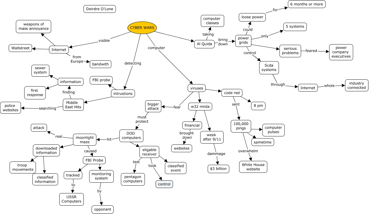 Este Cmap, tiene información relacionada con: cyber wars, Internet ???? weapons of mass annoyance, CYBER WARS detecting intrustions, moonlight maze real attack, viruses ???? code red, CYBER WARS computer viruses, power grids could loose power, financial brought down websites, power grids control Scda systems, Internet ???? Wallstreet, power grids ???? serious problems, w32 ninda ???? week after 9/11, FBI Probe ???? tracked, bigger attack must protect DOD computers, DOD computers hit moonlight maze, viruses fear bigger attack, loose power for 6 months or more, DOD computers ???? eligable receiver, power grids control Scda systems, w32 ninda ???? financial, 100,000 pings ???? computer pulses