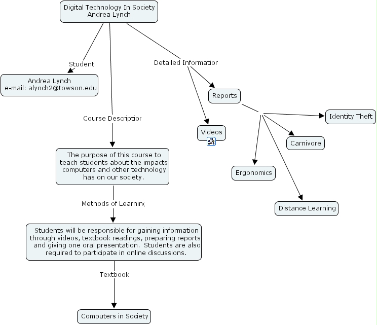 coursesummary, reports, andrea lynch e-mail alynch2@towson.edu, carnivore, digital technology in society andrea lynch, identity theft, distance learning, ergonomics, computers in society, videos, students will be responsible for gaining information through videos, textbook readings, preparing reports, and giving one oral presentation. students are also required to participate in online discussions., the purpose of this course to teach students about the impacts computers and other technology has on our society.