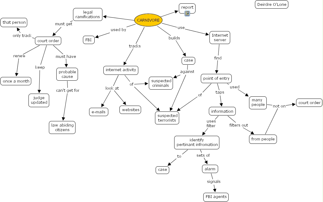 carnivore, information, legal ramifications, suspected terrorists, internet server, alarm, point of entry, e-mails, from people, judge updated, that person, websites, suspected criminals, court order, case, fbi agents, law abiding citizens, identify pertinant infromation, internet activity, report, carnivore, case, many people, once a month, court order, probable cause, fbi, deirdre o'lone