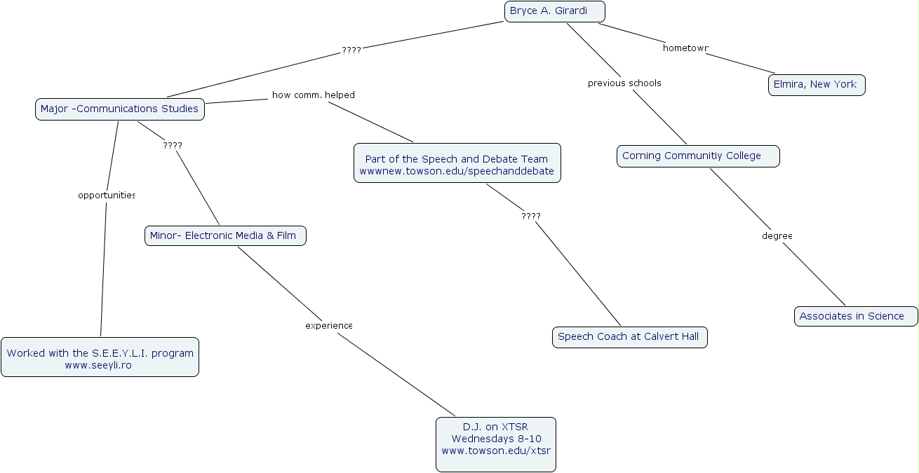 anthony, part of the speech and debate team wwwnew.towson.edu speechanddebate, corning communitiy college , worked with the s.e.e.y.l.i. program www.seeyli.ro, major -communications studies, d.j. on xtsr wednesdays 8-10 www.towson.edu xtsr , bryce a. girardi , associates in science , minor- electronic media & film, speech coach at calvert hall, elmira, new york