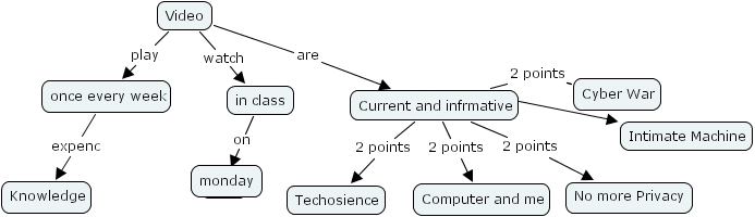 videos, current and infrmative, in class, once every week, video, ????, cyber war, techosience, knowledge, monday, no more privacy, intimate machine, computer and me