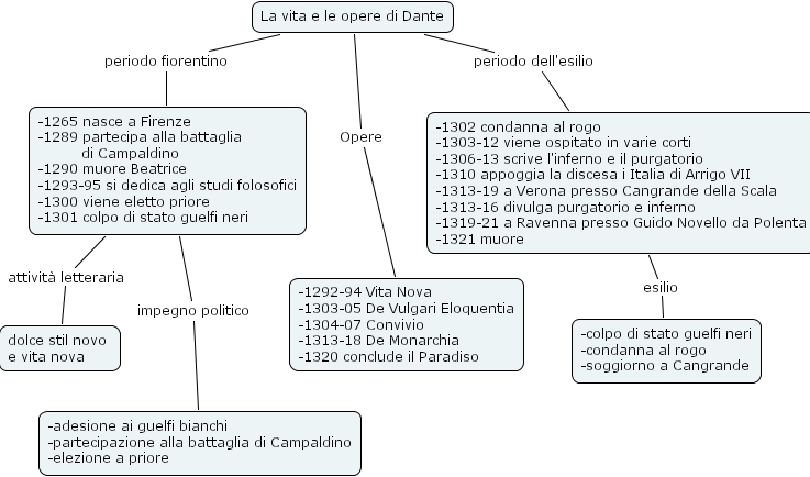 dante, -adesione ai guelfi bianchi -partecipazione alla battaglia di campaldino -elezione a priore, -1292-94 vita nova -1303-05 de vulgari eloquentia -1304-07 convivio -1313-18 de monarchia -1320 conclude il paradiso, la vita e le opere di dante, -colpo di stato guelfi neri -condanna al rogo -soggiorno a cangrande, dolce stil novo e vita nova, -1302 condanna al rogo -1303-12 viene ospitato in varie corti -1306-13 scrive l'inferno e il purgatorio -1310 appoggia la discesa i italia di arrigo vii -1313-19 a verona presso cangrande della scala -1313-16 divulga purgatorio e inferno -1319-21 a ravenna presso guido novello da polenta -1321 muore, -1265 nasce a firenze -1289 partecipa alla battaglia di campaldino -1290 muore beatrice -1293-95 si dedica agli studi folosofici -1300 viene eletto priore -1301 colpo di stato guelfi neri