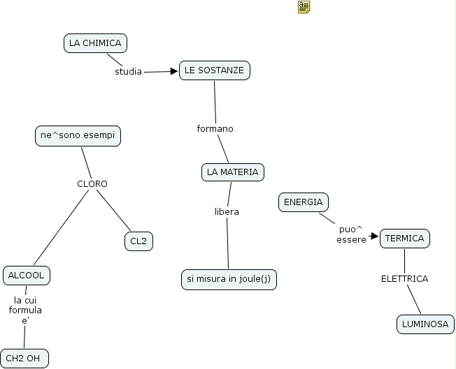 ENERGIA puo^ essere TERMICA, LE SOSTANZE formano LA MATERIA, ne^sono esempi CLORO CL2, ne^sono esempi CLORO ALCOOL, TERMICA ELETTRICA LUMINOSA, LA CHIMICA studia LE SOSTANZE, ALCOOL la cui formula e' CH2 OH , LA MATERIA libera si misura in joule(j)