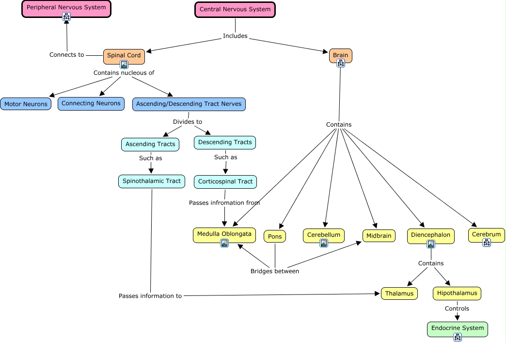 This Concept Map, created with IHMC CmapTools, has information related to: Central Nervous System, Spinothalamic Tract Passes information to Thalamus, Brain Contains Medulla Oblongata, Brain Contains Pons, Brain Contains Cerebellum, Corticospinal Tract Passes infromation from Medulla Oblongata, Spinal Cord Contains nucleous of Ascending/Descending Tract Nerves, Spinal Cord Connects to Peripheral Nervous System, Brain Contains Midbrain, Ascending/Descending Tract Nerves Divides to Ascending Tracts, Brain Contains Diencephalon, Hipothalamus Controls Endocrine System, Pons Bridges between Midbrain, Central Nervous System Includes Brain, Ascending/Descending Tract Nerves Divides to Descending Tracts, Spinal Cord Contains nucleous of Connecting Neurons, Spinal Cord Contains nucleous of Motor Neurons, Ascending Tracts Such as Spinothalamic Tract, Pons Bridges between Medulla Oblongata, Diencephalon Contains Thalamus, Diencephalon Contains Hipothalamus