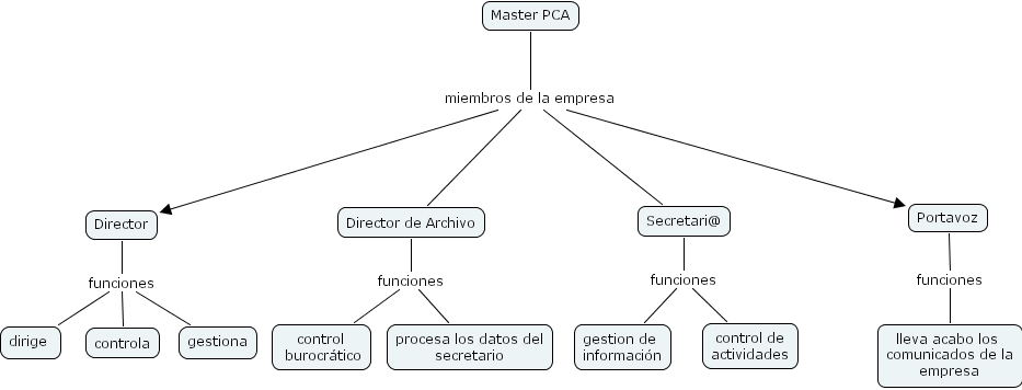 Secretari@ funciones control de actividades, Secretari@ funciones gestion de informaci�n, Director funciones dirige , Director funciones gestiona, Director funciones controla, Director de Archivo funciones control burocr�tico, Director de Archivo funciones procesa los datos del secretario, Portavoz funciones lleva acabo los comunicados de la empresa, Master PCA miembros de la empresa Portavoz, Master PCA miembros de la empresa Director, Master PCA miembros de la empresa Director de Archivo, Master PCA miembros de la empresa Secretari@