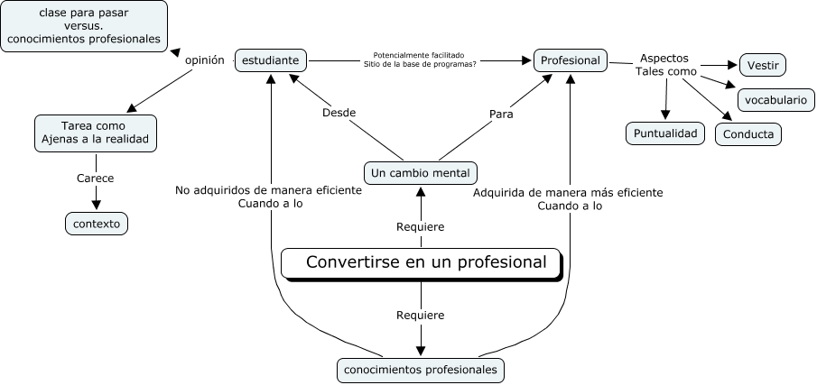Este mapa conceptual tiene información relacionada a: Shift_Student_to_Professional, conocimientos profesionales No adquiridos de manera eficiente Cuando a lo estudiante, Convertirse en un profesional Requiere Un cambio mental, Profesional Aspectos Tales como Puntualidad, Un cambio mental Desde estudiante, conocimientos profesionales Adquirida de manera más eficiente Cuando a lo Profesional, Tarea como Ajenas a la realidad Carece contexto, Profesional Aspectos Tales como Vestir, Un cambio mental Para Profesional, estudiante Potencialmente facilitado Sitio de la base de programas? Profesional, estudiante opinión clase para pasar versus. conocimientos profesionales