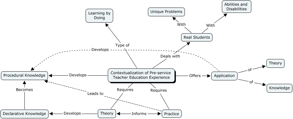 Contextualization_Preservice_Experience, Contextualization of Pre-service Teacher Education Experience Deals with Real Students, Contextualization of Pre-service Teacher Education Experience Develops Procedural Knowledge, Real Students With Unique Problems, Declarative Knowledge Becomes Procedural Knowledge, Contextualization of Pre-service Teacher Education Experience Type of Learning by Doing, Contextualization of Pre-service Teacher Education Experience Requires Theory, Application of Knowledge, Application of Theory, Contextualization of Pre-service Teacher Education Experience Requires Practice, Real Students With Abilities and Disabilities