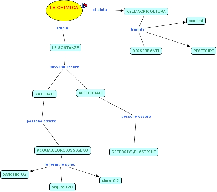 LA CHIMICA studia LE SOSTANZE, ACQUA,CLORO,OSSIGENO le formule sono: ossigeno:O2, ACQUA,CLORO,OSSIGENO le formule sono: cloro:Cl2, ACQUA,CLORO,OSSIGENO le formule sono: acqua:H2O, ARTIFICIALI possono essere DETERSIVI,PLASTICHE, LA CHIMICA ci aiuta NELL'AGRICOLTURA, NATURALI possono essere ACQUA,CLORO,OSSIGENO, LE SOSTANZE possono essere NATURALI, LE SOSTANZE possono essere ARTIFICIALI, NELL'AGRICOLTURA tramite DISSERBANTI, NELL'AGRICOLTURA tramite concimi, NELL'AGRICOLTURA tramite PESTICIDI