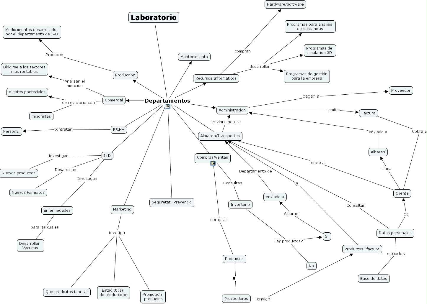 Si Albaran enviado a, Inventario Hay productos? No, Inventario Hay productos? Si, Datos personales situados Base de datos, Administracion emite Factura, Albaran enviado a Administracion, Almacen/Transportes envio a Cliente, Laboratorio Departamentos Recursos Informaticos, Laboratorio Departamentos Mantenimiento, Laboratorio Departamentos RR.HH, Laboratorio Departamentos Compras/Ventas, Laboratorio Departamentos Seguretat i Prevencio, Laboratorio Departamentos Comercial, Laboratorio Departamentos Produccion, Laboratorio Departamentos Marketing, Laboratorio Departamentos Administracion, Laboratorio Departamentos Almacen/Transportes, Laboratorio Departamentos I+D, Almacen/Transportes Consultan Datos personales, Recursos Informaticos compran Hardware/Software, RR.HH contratan Personal, Proveedores envian Productos i factura, I+D Investigan Enfermedades, Comercial se relaciona con clientes ponteciales, Comercial se relaciona con minoristas, Comercial Analizan el mercado Dirigirse a los sectores mas rentables, Marketing invetiga Estadicticas de produccci�n, Marketing invetiga Que prodcutos fabricar, Marketing invetiga Promoci�n productos, I+D Desarrollan Nuevos Farmacos, Compras/Ventas compran Productos, I+D Investigan Nuevos productos, Produccion Producen Medicamentos desarrollados por el departamento de I+D, Enfermedades para las cuales Desarrollan Vacunas, Almacen/Transportes envian factura Administracion, Cliente firma Albaran, Factura Cobra a Cliente, Productos i factura a Almacen/Transportes, Administracion pagan a Proveedor, Productos a Proveedores, enviado a Departamento de Almacen/Transportes, Recursos Informaticos desarrollan Programas para analisis de sustancias, Recursos Informaticos desarrollan Programas de gesti�n para la empresa, Recursos Informaticos desarrollan Programas de simulacion 3D , Datos personales de Cliente, Compras/Ventas Consultan Inventario