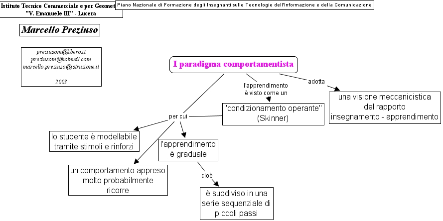 I paradigma comportamentista adotta una visione meccanicistica del rapporto insegnamento - apprendimento, I paradigma comportamentista l'apprendimento � visto come un "condizionamento operante" (Skinner), "condizionamento operante" (Skinner) per cui un comportamento appreso molto probabilmente ricorre, "condizionamento operante" (Skinner) per cui lo studente � modellabile tramite stimoli e rinforzi, "condizionamento operante" (Skinner) per cui l'apprendimento � graduale, l'apprendimento � graduale cio� � suddiviso in una serie sequenziale di piccoli passi, I paradigma comportamentista per cui un comportamento appreso molto probabilmente ricorre, I paradigma comportamentista per cui lo studente � modellabile tramite stimoli e rinforzi, I paradigma comportamentista per cui l'apprendimento � graduale