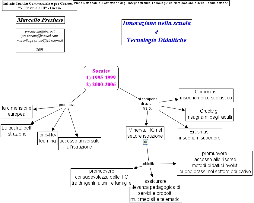 Minerva: TIC nel settore istruzione obiettivi promuovere -accesso alle risorse -metodi didattici evoluti -buone prassi nel settore educativo, Minerva: TIC nel settore istruzione obiettivi promuovere consapevolezza delle TIC tra dirigenti, alunni e famiglie, Minerva: TIC nel settore istruzione obiettivi assicurare rilevanza pedagogica di servizi e prodotti multimediali e telematici, Socates 1) 1995-1999 2) 2000-2006 promuove La qualit� dell' istruzione, Socates 1) 1995-1999 2) 2000-2006 promuove la dimensione europea, Socates 1) 1995-1999 2) 2000-2006 promuove long-life- learning, Socates 1) 1995-1999 2) 2000-2006 promuove accesso universale all'istruzione, Socates 1) 1995-1999 2) 2000-2006 si compone di azioni tra cui Minerva: TIC nel settore istruzione, Socates 1) 1995-1999 2) 2000-2006 si compone di azioni tra cui Grudtvig: insagnam. degli adulti, Socates 1) 1995-1999 2) 2000-2006 si compone di azioni tra cui Comenius: insegnamento scolastico, Socates 1) 1995-1999 2) 2000-2006 si compone di azioni tra cui Erasmus: insegnam.superiore