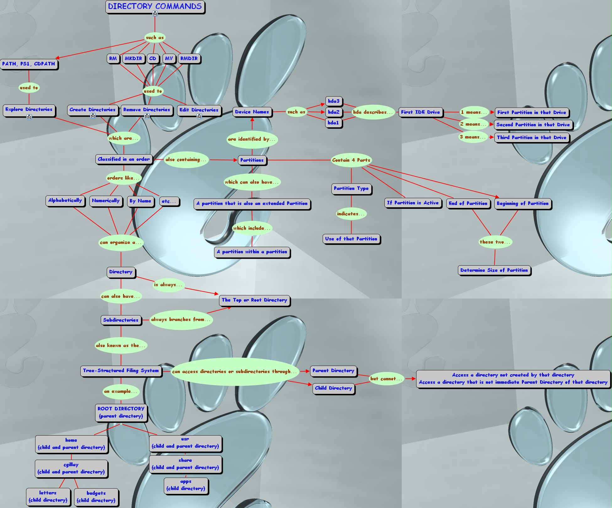 etc... can organize a... Directory, Parent Directory but cannot... Access a directory not created by that directory Access a directory that is not immediate Parent Directory of that directory, ROOT DIRECTORY (parent directory) usr (child and parent directory), ROOT DIRECTORY (parent directory) home (child and parent directory), Tree-Structured Filing System can access directories or subdirectories through... Child Directory, Tree-Structured Filing System can access directories or subdirectories through... Parent Directory, Numerically can organize a... Directory, By Name can organize a... Directory, End of Partition these two... Determine Size of Partition, RM used to Edit Directories, RM used to Create Directories, RM used to Remove Directories, Subdirectories also known as the... Tree-Structured Filing System, Partitions Contain 4 Parts End of Partition, Partitions Contain 4 Parts Beginning of Partition, Partitions Contain 4 Parts If Partition is Active, Partitions Contain 4 Parts Partition Type, Remove Directories which are... Classified in an order, Device Names such as hda1, Device Names such as hda3, Device Names such as hda2, hda3 hda describes... First IDE Drive, Create Directories which are... Classified in an order, Partitions which can also have... A partition that is also an extended Partition, Beginning of Partition these two... Determine Size of Partition, Classified in an order also containing... Partitions, share (child and parent directory) apps (child directory), hda1 hda describes... First IDE Drive, Partitions are identified by... Device Names, Explore Directories which are... Classified in an order, A partition that is also an extended Partition which include... A partition within a partition, Partition Type indicates... Use of that Partition, Tree-Structured Filing System an example... ROOT DIRECTORY (parent directory), First IDE Drive 1 means... First Partition in that Drive, Directory is always... The Top or Root Directory, Subdirectories always branches from... The Top or Root Directory, RMDIR used to Edit Directories, RMDIR used to Create Directories, RMDIR used to Remove Directories, MV used to Edit Directories, MV used to Create Directories, MV used to Remove Directories, cgillay (child and parent directory) budgets (child directory), cgillay (child and parent directory) letters (child directory), DIRECTORY COMMANDS such as MKDIR, DIRECTORY COMMANDS such as PATH, PS1, CDPATH, DIRECTORY COMMANDS such as RMDIR, DIRECTORY COMMANDS such as CD, DIRECTORY COMMANDS such as MV, DIRECTORY COMMANDS such as RM, hda2 hda describes... First IDE Drive, CD used to Edit Directories, CD used to Create Directories, CD used to Remove Directories, Classified in an order orders like... Numerically, Classified in an order orders like... etc..., Classified in an order orders like... By Name, Classified in an order orders like... Alphabetically, Child Directory but cannot... Access a directory not created by that directory Access a directory that is not immediate Parent Directory of that directory, usr (child and parent directory) share (child and parent directory), PATH, PS1, CDPATH used to Explore Directories, MKDIR used to Edit Directories, MKDIR used to Create Directories, MKDIR used to Remove Directories, First IDE Drive 3 means... Third Partition in that Drive, First IDE Drive 2 means... Second Partition in that Drive, home (child and parent directory) cgillay (child and parent directory), Directory can also have... Subdirectories, Alphabetically can organize a... Directory