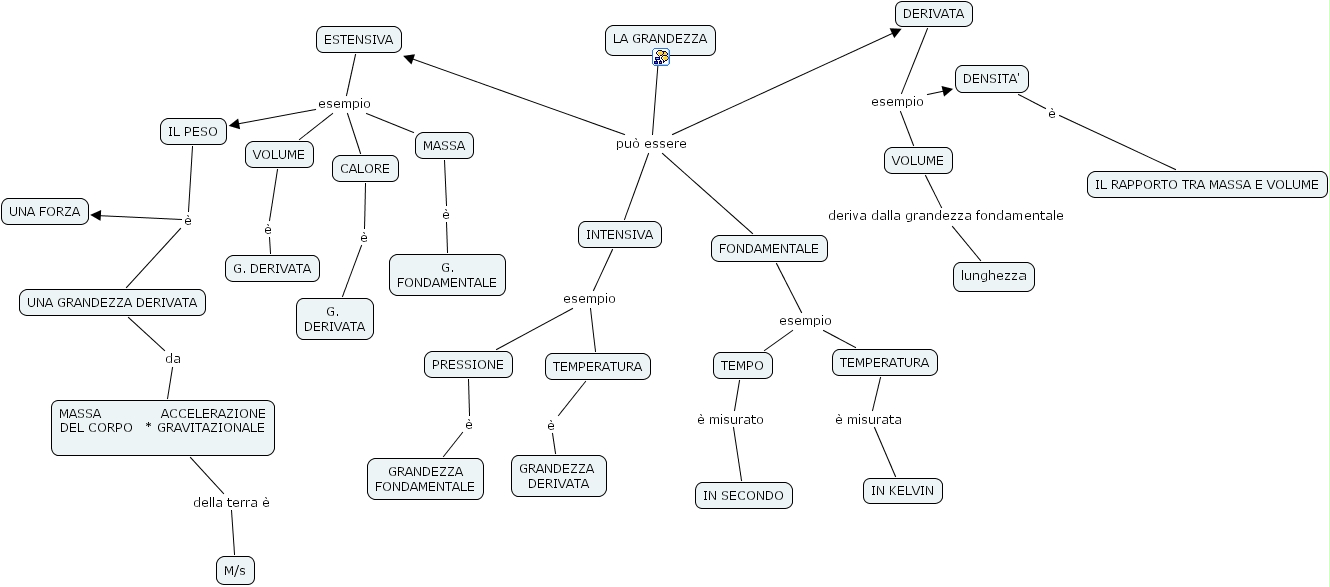 CALORE � G. DERIVATA, VOLUME deriva dalla grandezza fondamentale lunghezza, FONDAMENTALE esempio TEMPERATURA, FONDAMENTALE esempio TEMPO, TEMPO � misurato IN SECONDO, ESTENSIVA esempio MASSA, ESTENSIVA esempio VOLUME, ESTENSIVA esempio IL PESO, ESTENSIVA esempio CALORE, IL PESO � UNA GRANDEZZA DERIVATA, IL PESO � UNA FORZA, LA GRANDEZZA pu� essere ESTENSIVA, LA GRANDEZZA pu� essere DERIVATA, LA GRANDEZZA pu� essere INTENSIVA, LA GRANDEZZA pu� essere FONDAMENTALE, VOLUME � G. DERIVATA, INTENSIVA esempio TEMPERATURA, INTENSIVA esempio PRESSIONE, UNA GRANDEZZA DERIVATA da MASSA ACCELERAZIONE DEL CORPO * GRAVITAZIONALE , TEMPERATURA � GRANDEZZA DERIVATA, DERIVATA esempio VOLUME, DERIVATA esempio DENSITA', PRESSIONE � GRANDEZZA FONDAMENTALE, DENSITA' � IL RAPPORTO TRA MASSA E VOLUME, MASSA ACCELERAZIONE DEL CORPO * GRAVITAZIONALE della terra � M/s, MASSA � G. FONDAMENTALE, TEMPERATURA � misurata IN KELVIN