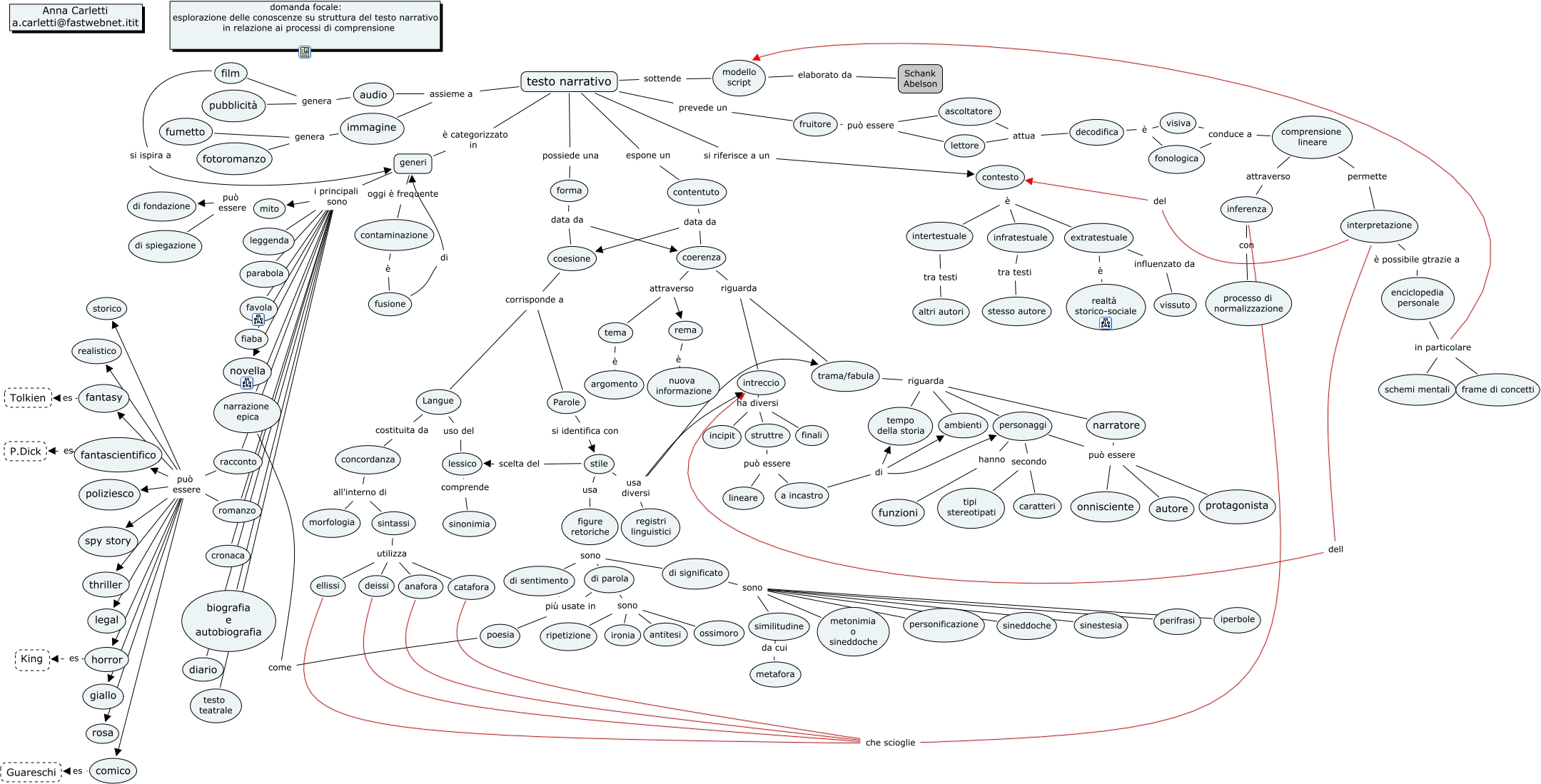 This Concept Map, created with IHMC CmapTools, has information related to: testo narrativo, similitudine da cui metafora, contentuto data da coerenza, narratore può essere protagonista, extratestuale è realtà storico-sociale, di significato sono iperbole, film si ispira a generi, tema è argomento, interpretazione dell intreccio, generi i principali sono testo teatrale, modello script elaborato da Schank Abelson, intreccio ha diversi finali, fruitore può essere ascoltatore, fantasy es Tolkien, narratore può essere personaggi, narratore può essere onnisciente, inferenza che scioglie catafora, a incastro di ambienti, di parola sono ripetizione, racconto può essere spy story, di parola più usate in poesia