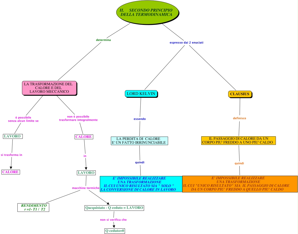 This Concept Map, created with IHMC CmapTools, has information related to: 2 termodinamica, IL SECONDO PRINCIPIO DELLA TERMODINAMICA espresso dai 2 enuciati CLAUSIUS, IL SECONDO PRINCIPIO DELLA TERMODINAMICA determina LA TRASFORMAZIONE DEL CALORE E DEL LAVORO MECCANICO, CALORE in LAVORO, LORD KELVIN essendo LA PERDITA DI CALORE E' UN FATTO IRRINUNCIABILE, Qacquistato - Q ceduto = LAVORO non si verifica che Q ceduto=0, LA TRASFORMAZIONE DEL CALORE E DEL LAVORO MECCANICO non è possibile trasformare integralmente CALORE, IL SECONDO PRINCIPIO DELLA TERMODINAMICA espresso dai 2 enuciati LORD KELVIN, LAVORO macchine termiche RENDIMENTO r =1- T1 / T2, CLAUSIUS definisce IL PASSAGGIO DI CALORE DA UN CORPO PIU' FREDDO A UNO PIU' CALDO, LA PERDITA DI CALORE E' UN FATTO IRRINUNCIABILE quindi E' IMPOSSIBILE REALIZZARE UNA TRASFORMAZIONE IL CUI UNICO RISULTATO SIA " SOLO " LA CONVERSIONE DI CALORE IN LAVORO, IL PASSAGGIO DI CALORE DA UN CORPO PIU' FREDDO A UNO PIU' CALDO quindi E' IMPOSSIBILE REALIZZARE UNA TRASFORMAZIONE IL CUI "UNICO RISULTATO" SIA IL PASSAGGIO DI CALORE DA UN CORPO PIU' FREDDO A QUELLO PIU' CALDO, LA TRASFORMAZIONE DEL CALORE E DEL LAVORO MECCANICO è possibile senza alcun limite se LAVORO, LAVORO macchine termiche Qacquistato - Q ceduto = LAVORO, LAVORO si trasforma in CALORE