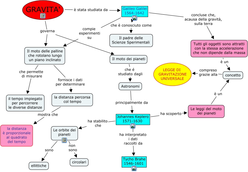 This Concept Map, created with IHMC CmapTools, has information related to: gravità, Le orbite dei pianeti sono ellittiche, Le orbite dei pianeti non sono circolari, GRAVITA' è stata studiata da Galileo Galilei 1564-1642, GRAVITA' governa Il moto dei pianeti, Johannes Keplero 1571-1630 ha interpretato i dati raccolti da Tycho Brahe 1546-1601, Johannes Keplero 1571-1630 ha stabilito che Le orbite dei pianeti, Galileo Galilei 1564-1642 compie esperimenti su Il moto delle palline che rotolano lungo un piano inclinato, Il moto delle palline che rotolano lungo un piano inclinato fornisce i dati per determinare la distanza percorsa col tempo, la distanza percorsa col tempo mostra che la distanza è proporzionale al quadrato del tempo, Astronomi principalmente da Johannes Keplero 1571-1630, concetto compreso grazie alla LEGGE DI GRAVITAZIONE UNIVERSALE, Il moto delle palline che rotolano lungo un piano inclinato che permette di misurare il tempo impiegato per percorrere le diverse distanze, Le leggi del moto dei pianeti è un concetto, Johannes Keplero 1571-1630 ha scoperto Le leggi del moto dei pianeti, Galileo Galilei 1564-1642 concluse che, acausa della gravità, sulla terra Tutti gli oggetti sono attratti con la stessa accelerazione che non dipende dalla massa, GRAVITA' governa Il moto delle palline che rotolano lungo un piano inclinato, Galileo Galilei 1564-1642 che è conosciuto come Il padre delle Scienze Sperimentali, Il moto dei pianeti che é studiato dagli Astronomi, Tutti gli oggetti sono attratti con la stessa accelerazione che non dipende dalla massa è un concetto