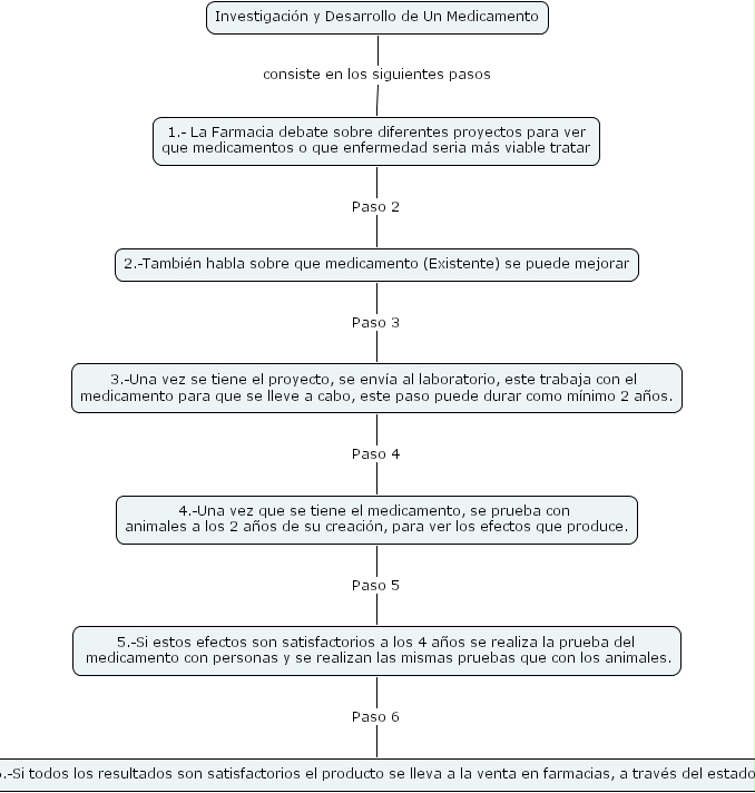 3.-Una vez se tiene el proyecto, se env�a al laboratorio, este trabaja con el medicamento para que se lleve a cabo, este paso puede durar como m�nimo 2 a�os. Paso 4 4.-Una vez que se tiene el medicamento, se prueba con animales a los 2 a�os de su creaci�n, para ver los efectos que produce., 1.- La Farmacia debate sobre diferentes proyectos para ver que medicamentos o que enfermedad seria m�s viable tratar Paso 2 2.-Tambi�n habla sobre que medicamento (Existente) se puede mejorar, 5.-Si estos efectos son satisfactorios a los 4 a�os se realiza la prueba del medicamento con personas y se realizan las mismas pruebas que con los animales. Paso 6 6.-Si todos los resultados son satisfactorios el producto se lleva a la venta en farmacias, a trav�s del estado., Investigaci�n y Desarrollo de Un Medicamento consiste en los siguientes pasos 1.- La Farmacia debate sobre diferentes proyectos para ver que medicamentos o que enfermedad seria m�s viable tratar, 4.-Una vez que se tiene el medicamento, se prueba con animales a los 2 a�os de su creaci�n, para ver los efectos que produce. Paso 5 5.-Si estos efectos son satisfactorios a los 4 a�os se realiza la prueba del medicamento con personas y se realizan las mismas pruebas que con los animales., 2.-Tambi�n habla sobre que medicamento (Existente) se puede mejorar Paso 3 3.-Una vez se tiene el proyecto, se env�a al laboratorio, este trabaja con el medicamento para que se lleve a cabo, este paso puede durar como m�nimo 2 a�os.