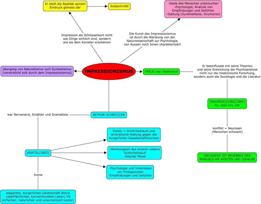 This Concept Map, created with IHMC CmapTools, has information related to: Impressionismus giuli V°b, ANATOL(1893) ???? -Wertlosigkeit des inneren Lebens -Schönheitskult -falscher Moral, TRAUMDEUTUNG(1900) Es, über Ich, Ich konflikt = Neurosen (Menschen schwach) DECADENZ IST ERGEBNIS DES MANGELS AM WERTEN UND IDEALEN, ANATOL(1893) Ironie eleganten, burgerlichen Gesellschaft Wiens (oberflächliches, konventionelles Leben) VS einfachen, naturlichen und unkompliziert Leuten, ANATOL(1893) ???? Dandy = Schönheitskult und amoralische Haltung gegen die burgerlichen Gesellschaftsnormen, IMPRESSIONISMUS ???? FREUD war Seelenarzt, IMPRESSIONISMUS Die Kunst des Impressionismus ist durch die Wendung von der Naturwissenschaft zur Psychologie, von Aussen noch Innen charakterisiert -Seele des Menschen untersuchen -Psychologie, Analyse von Empfindungen und Gefühlen -Gattung (Synehsthesie, Oxymoron), ARTHUR SCHNITZLER war Nervenarzt, Erzähler und Dramatiker ANATOL(1893), ANATOL(1893) ???? -Psychologie und Innenleben der Protagonisten -Empfindungen und Gefühlen, IMPRESSIONISMUS Impression als Schlüsselwort nicht wie Dinge wirklich sind, sondern wie sie dem Künstler erscheinen Er stellt die Realität seinem Eindruck gemass dar, IMPRESSIONISMUS ???? übergang von Naturalismus zum Symbolismus (verwirklicht sich durch dem Impressionismus), IMPRESSIONISMUS ???? ARTHUR SCHNITZLER, FREUD war Seelenarzt Er beeinflusste mit seine Theorien und seine Entwickung der Psychoanalyse nicht nur die medizinische Forschung, sondern auch die Soziologie und die Literatur TRAUMDEUTUNG(1900) Es, über Ich, Ich, Er stellt die Realität seinem Eindruck gemass dar ???? Subjectivität