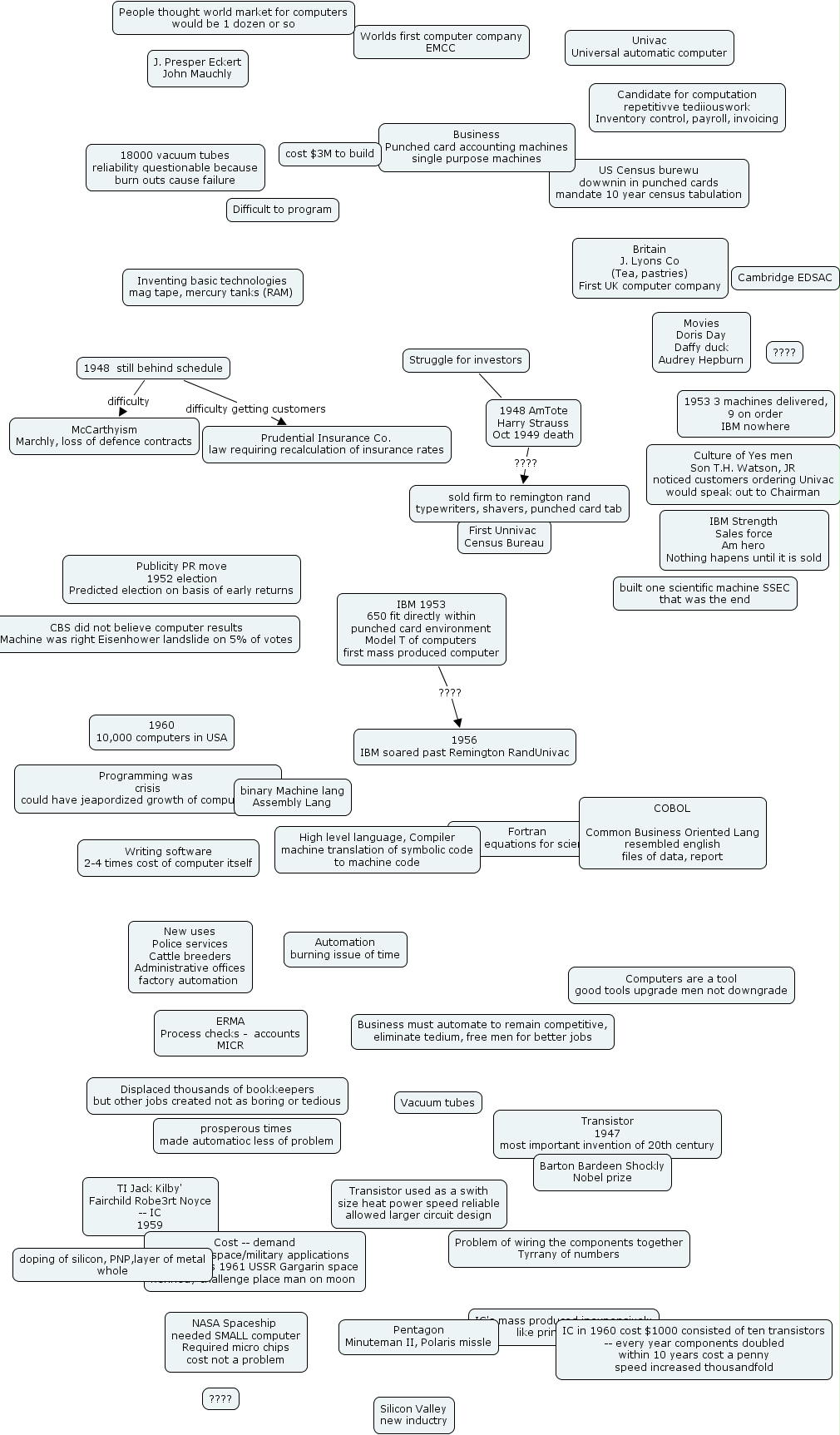Struggle for investors ???? 1948 AmTote Harry Strauss Oct 1949 death, IBM 1953 650 fit directly within punched card environment Model T of computers first mass produced computer ???? 1956 IBM soared past Remington RandUnivac, 1948 still behind schedule difficulty getting customers Prudential Insurance Co. law requiring recalculation of insurance rates, 1948 still behind schedule difficulty McCarthyism Marchly, loss of defence contracts, 1948 AmTote Harry Strauss Oct 1949 death ???? sold firm to remington rand typewriters, shavers, punched card tab