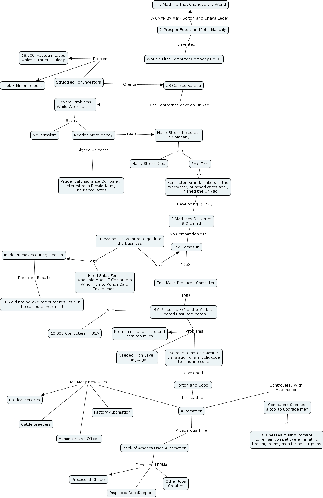 made PR moves during election Predicted Results CBS did not believe computer results but the computer was right, Computers Seen as a tool to upgrade men SO Businesses must Automate to remain competitive eliminating tedium, freeing men for better jobbs, Several Problems While Working on it Such as: Needed More Money, Several Problems While Working on it Such as: McCarthyism, Bank of America Used Automation Developed ERMA Displaced BookKeepers, Bank of America Used Automation Developed ERMA Other Jobs Created, Bank of America Used Automation Developed ERMA Processed Checks, Automation Prosperous Time Bank of America Used Automation, TH Watson Jr. Wanted to get into the business 1952 made PR moves during election, TH Watson Jr. Wanted to get into the business 1952 Hired Sales Force who sold Model T Computers Which fit into Punch Card Environment, Automation Controversy With Automation Computers Seen as a tool to upgrade men, IBM Produced 3/4 of the Market, Soared Past Remington 1960 10,000 Computers in USA, TH Watson Jr. Wanted to get into the business 1952 IBM Comes In, IBM Comes In 1953 First Mass Produced Computer, Automation Had Many New Uses Administrative Offices, Automation Had Many New Uses Cattle Breeders, Automation Had Many New Uses Factory Automation, Automation Had Many New Uses Political Services, US Census Bureau Got Contract to develop Univac Several Problems While Working on it, Needed More Money Signed Up With: Prudential Insurance Company, Interested in Recalculating Insurance Rates, Struggled For Investors Clients US Census Bureau, J. Presper Eckert and John Mauchly A CMAP By Mark Bolton and Chaya Leder The Machine That Changed the World, World's First Computer Company EMCC Problems 18,000 vaccuum tubes which burnt out quickly, World's First Computer Company EMCC Problems Struggled For Investors, World's First Computer Company EMCC Problems Took 3 Million to build, Remington Brand, makers of the typewriter, punched cards and , Finished the Univac Developing Quickly 3 Machines Delivered 9 Ordered, First Mass Produced Computer 1956 IBM Produced 3/4 of the Market, Soared Past Remington, Forton and Cobol This Lead to Automation, Needed More Money 1948 Harry Stress Invested in Company, Needed compiler machine translation of symbolic code to machine code Developed Forton and Cobol, J. Presper Eckert and John Mauchly Invented World's First Computer Company EMCC, IBM Produced 3/4 of the Market, Soared Past Remington Problems Needed High Level Language, IBM Produced 3/4 of the Market, Soared Past Remington Problems Programming too hard and cost too much, IBM Produced 3/4 of the Market, Soared Past Remington Problems Needed compiler machine translation of symbolic code to machine code, Harry Stress Invested in Company 1949 Harry Stress Died, Harry Stress Invested in Company 1949 Sold Firm, Sold Firm 1953 Remington Brand, makers of the typewriter, punched cards and , Finished the Univac, 3 Machines Delivered 9 Ordered No Competition Yet IBM Comes In
