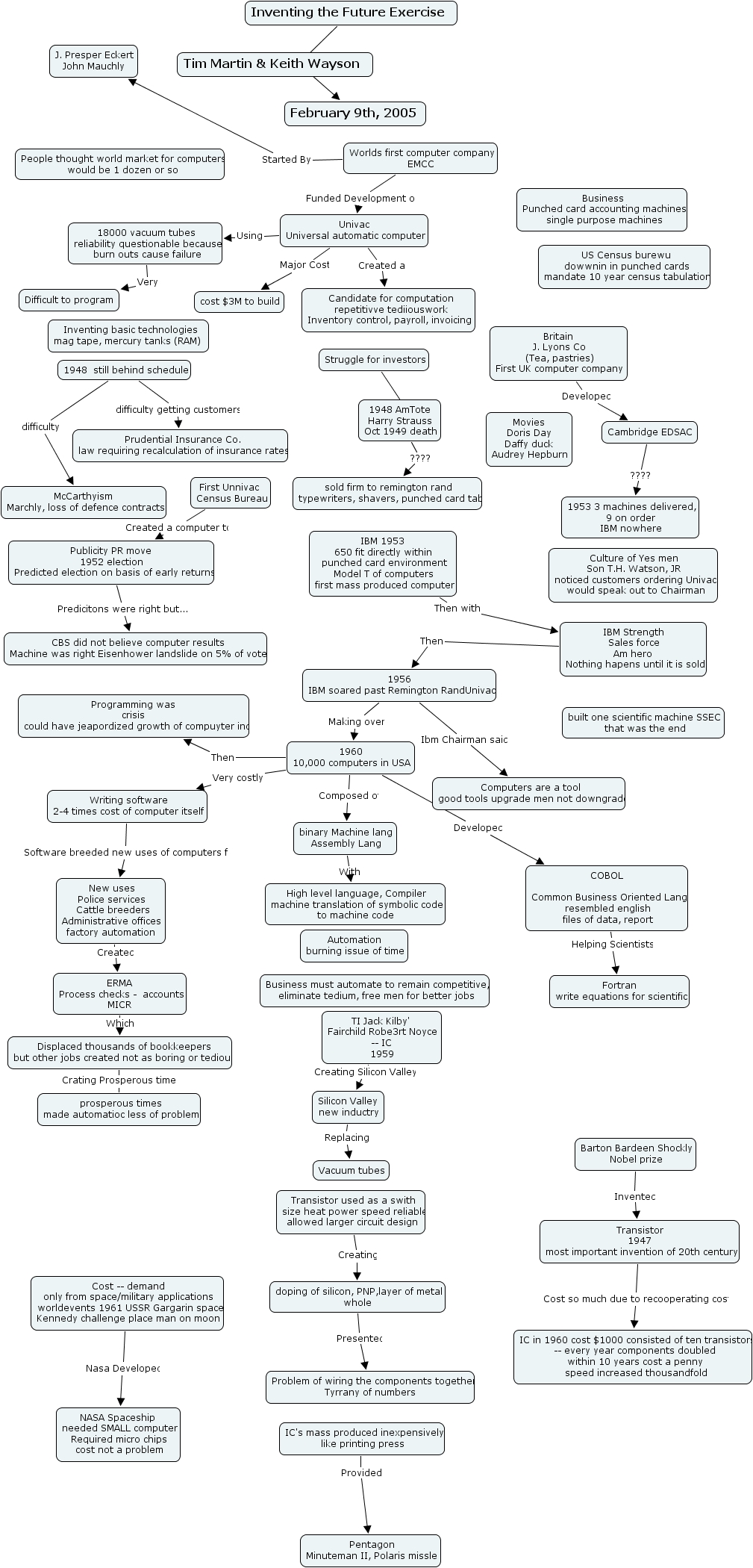 tim martin & keith wayson, worlds first computer company emcc, first unnivac census bureau, silicon valley new inductry, britain j. lyons co (tea, pastries) first uk computer company, fortran write equations for scientific, people thought world market for computers would be 1 dozen or so, us census burewu dowwnin in punched cards mandate 10 year census tabulation, inventing basic technologies mag tape, mercury tanks (ram) , transistor 1947 most important invention of 20th century, inventing the future exercise, 1956 ibm soared past remington randunivac, ti jack kilby' fairchild robe3rt noyce -- ic 1959, writing software 2-4 times cost of computer itself, erma process checks - accounts micr, ibm 1953 650 fit directly within punched card environment model t of computers first mass produced computer, nasa spaceship needed small computer required micro chips cost not a problem, culture of yes men son t.h. watson, jr noticed customers ordering univac would speak out to chairman, sold firm to remington rand typewriters, shavers, punched card tab, prudential insurance co. law requiring recalculation of insurance rates, programming was crisis could have jeapordized growth of compuyter ind, business punched card accounting machines single purpose machines, built one scientific machine ssec that was the end, cobol common business oriented lang resembled english files of data, report, ic's mass produced inexpensively like printing press, cambridge edsac, 18000 vacuum tubes reliability questionable because burn outs cause failure, displaced thousands of bookkeepers but other jobs created not as boring or tedious, 1960 10,000 computers in usa, univac universal automatic computer, transistor used as a swith size heat power speed reliable allowed larger circuit design, 1948 still behind schedule, 1953 3 machines delivered, 9 on order ibm nowhere, difficult to program, cost $3m to build, high level language, compiler machine translation of symbolic code to machine code, ic in 1960 cost $1000 consisted of ten transistors -- every year components doubled within 10 years cost a penny speed increased thousandfold, problem of wiring the components together tyrrany of numbers, cost -- demand only from space military applications worldevents 1961 ussr gargarin space kennedy challenge place man on moon , vacuum tubes, computers are a tool good tools upgrade men not downgrade, movies doris day daffy duck audrey hepburn, 1948 amtote harry strauss oct 1949 death, candidate for computation repetitivve tediiouswork inventory control, payroll, invoicing, j. presper eckert john mauchly, business must automate to remain competitive, eliminate tedium, free men for better jobs, struggle for investors, new uses police services cattle breeders administrative offices factory automation , publicity pr move 1952 election predicted election on basis of early returns, doping of silicon, pnp,layer of metal whole, tim martin & keith wayson, automation burning issue of time, ibm strength sales force am hero nothing hapens until it is sold, binary machine lang assembly lang, pentagon minuteman ii, polaris missle, barton bardeen shockly nobel prize, mccarthyism marchly, loss of defence contracts, cbs did not believe computer results machine was right eisenhower landslide on 5% of votes, prosperous times made automatioc less of problem, february 9th, 2005